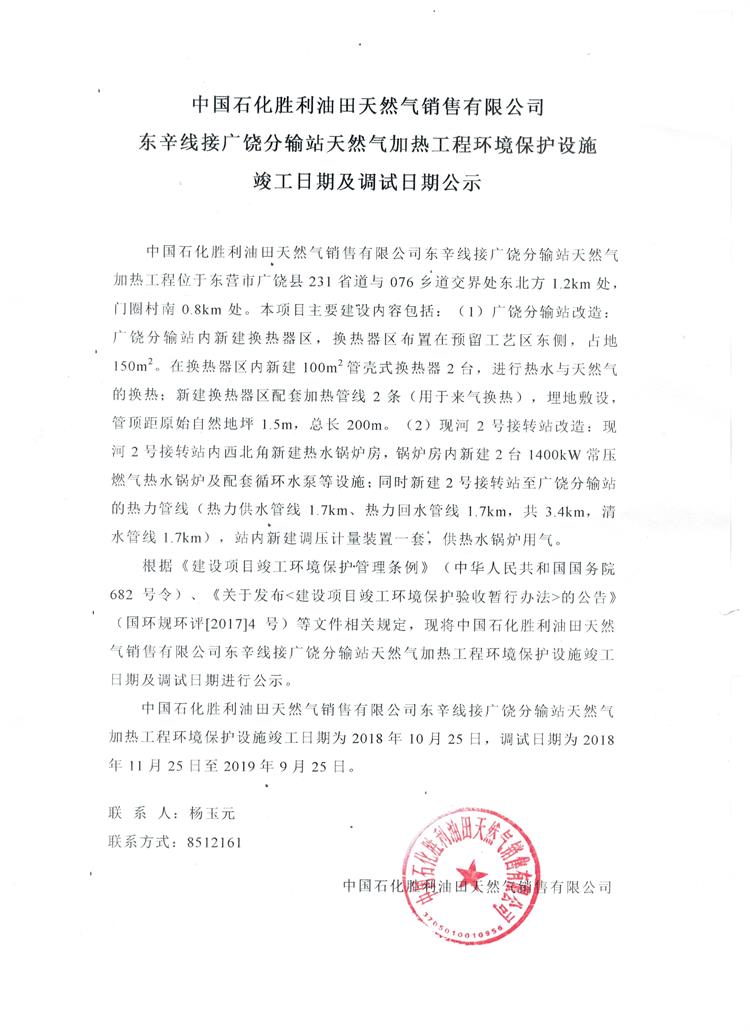 中國(guó)石化勝利油田天然氣銷售有限公司東辛線接廣饒分輸站天然氣加熱工程環(huán)境保護(hù)設(shè)施竣工日期及調(diào)試日期公示
