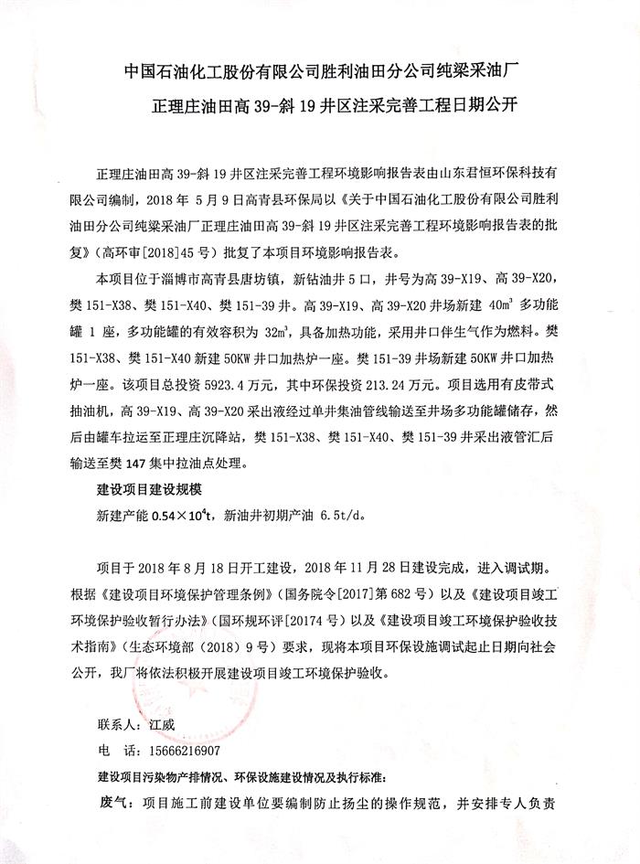 中國石油化工股份有限公司勝利油田分公司純梁采油廠正理莊油田高39-斜19井區(qū)注采完善工程日期公開