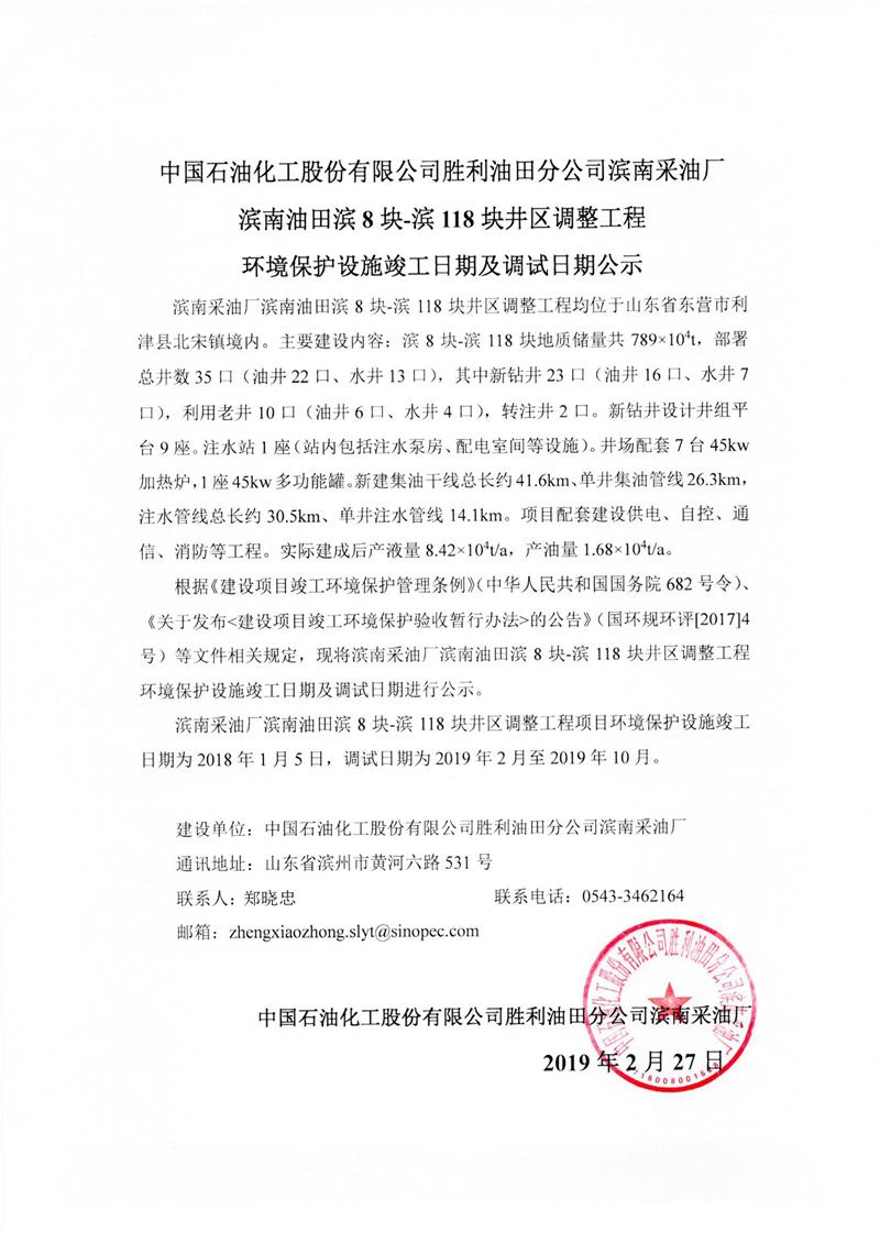 中國石油化工股份有限公司勝利油田分公司濱南采油廠濱8塊-濱118塊井區(qū)調(diào)整工程環(huán)境保護設施竣工日期及調(diào)試日期公示