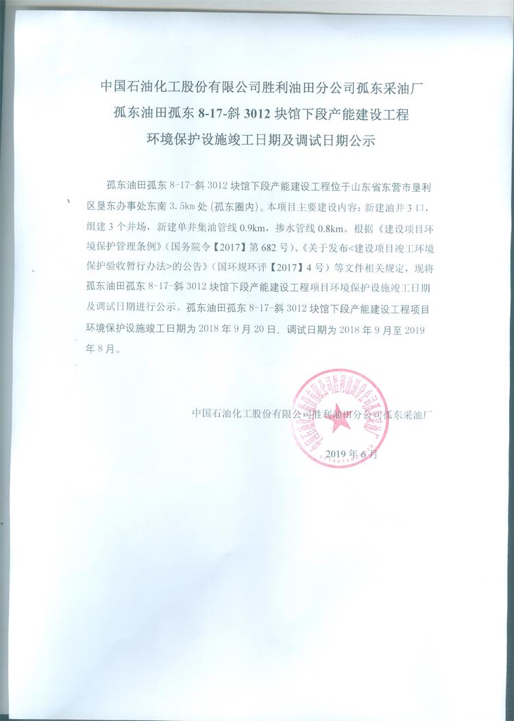 中國石油化工股份有限公司勝利油田分公司孤東采油廠孤東油田孤東8-17斜3012塊館下段產能建設工程環境保護設施竣工日期及調試日期公示