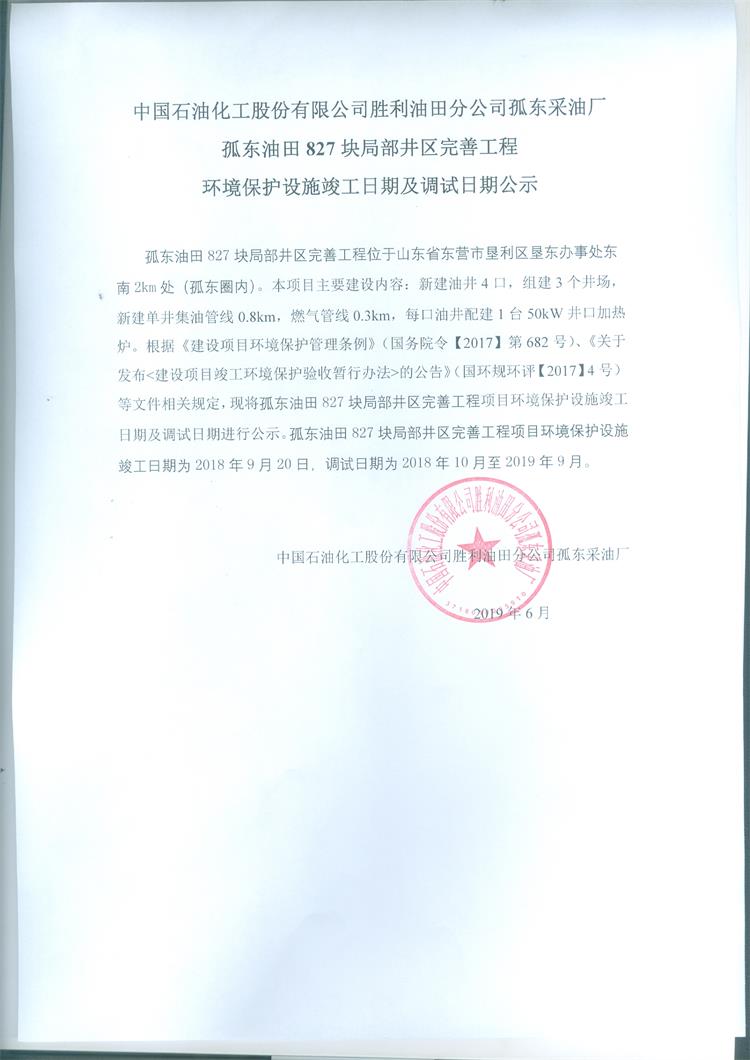 中國(guó)石油化工股份有限公司勝利油田分公司孤東采油廠孤東油田827塊局部井區(qū)完善工程環(huán)境保護(hù)設(shè)施竣工日期及調(diào)試日期公示